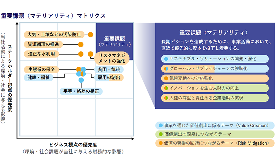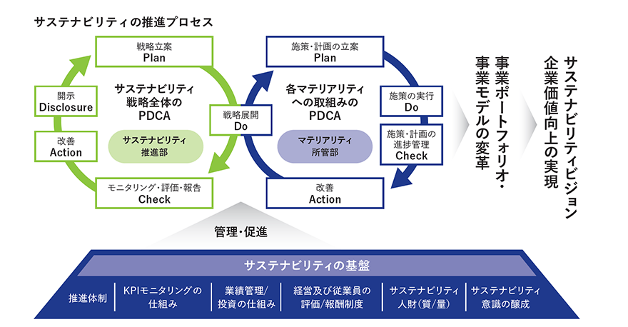 サステナビリティに関する取組みの実行は各重要課題(マテリアリティ)の担当部署が行い、グループ各社の事業にサステナビリティ戦略を落とし込みながら、事業ポートフォリオ・事業モデルの変革を推進しています。