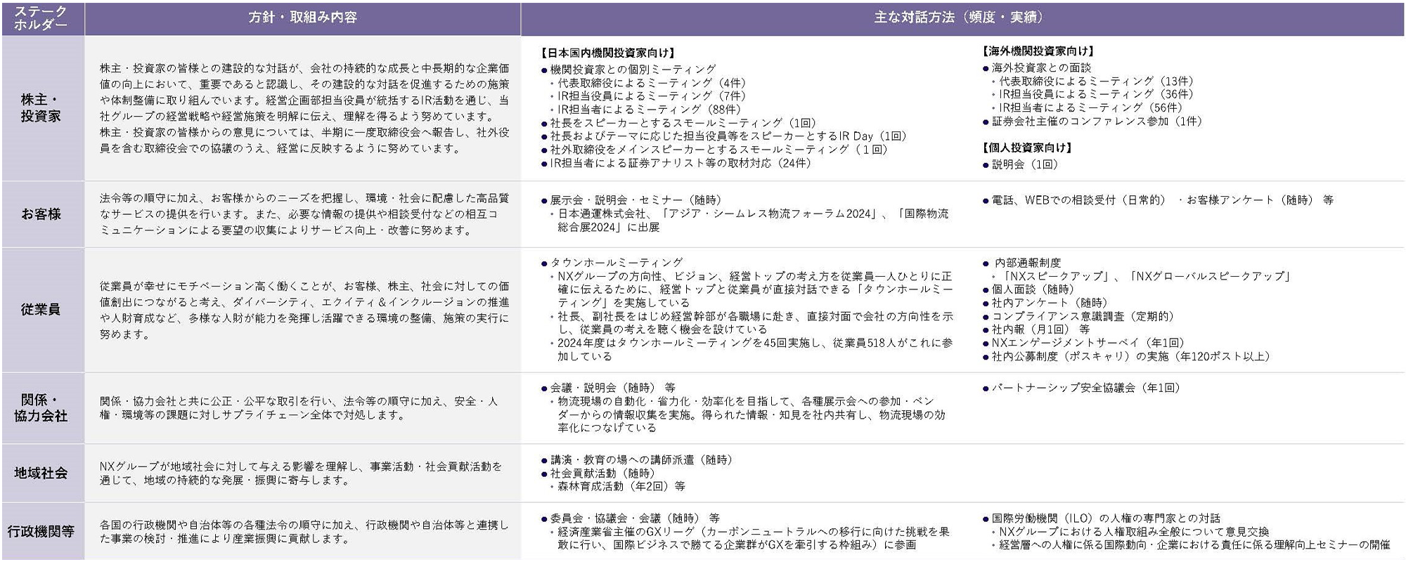 NXグループは、サステナビリティ経営を通じて社会課題を解決することで豊かな未来を創出し、企業価値を向上していくためには、幅広いステークホルダーの皆さまと双方向のコミュニケーションを持つことが重要と考えています。
