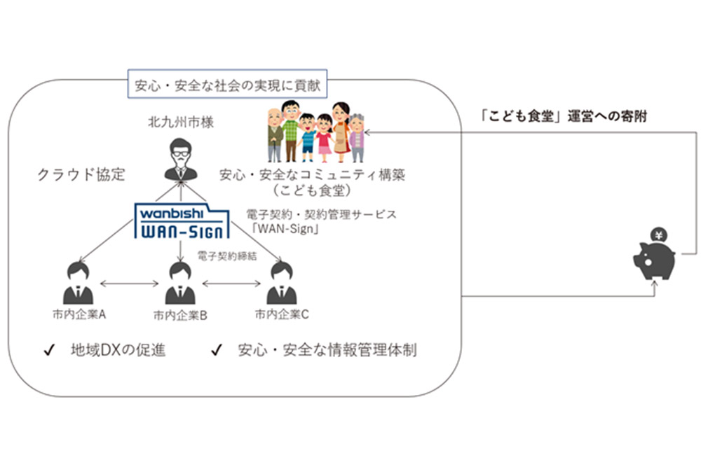 北九州市は「こども食堂」を運営し、孤食や貧困といった社会課題の解消に取り組んでおり、地域の皆様に安心・安全な居場所を提供しています。同社はこの事業を支援するため、北九州市内の企業が「WAN-Sign」を利用することで、その利用料の一部を「こども食堂」事業の運営費に還元する「北九州市版地域還元モデル」の取り組みを始めました。この取り組みを通じ、地域社会の「安心・安全」な環境作りと情報管理体制の強化に貢献しています。