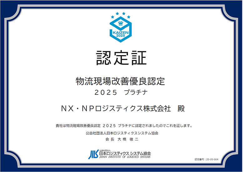 同社は、公益社団法人日本ロジスティクスシステム協会による「物流現場改善優良認定制度」において「物流現場改善優良認定2025(プラチナ)」に認定されました。「物流現場改善優良認定制度」とは、物流現場の改善に積極的に取り組む先進企業を認定し、その取り組みを産業界全体に広く周知することを目的とした制度です。「全日本物流改善事例大会」で発表された改善事例の評価結果に基づいてポイントが付与され、過去3年度の累積ポイント数で認定ランクが決まります。2025年度の認定は2022年4月1日~2025年3月末日までの活動に基づいた評価となります。