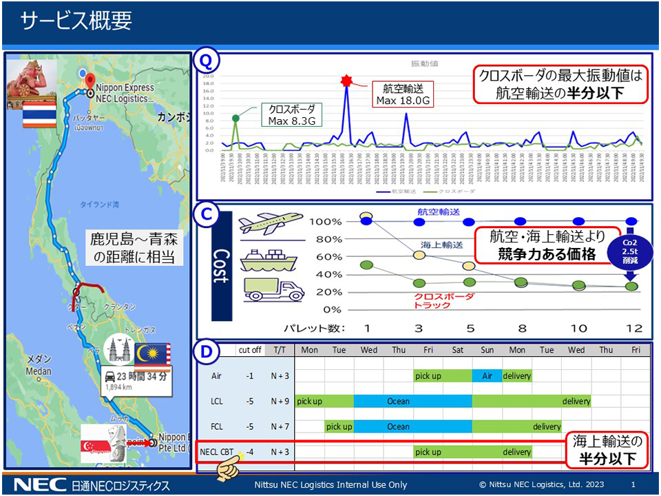 日通NECロジスティクス株式会社の海外子会社である日通NECロジスティクス・シンガポール社と、同、日通NECロジスティクス・タイ社は、お客様のCO2削減に貢献する輸送サービスメニューとして、シンガポール発タイ向けの輸送ニーズに対し、クロスボーダートラック共同輸送を提供しております。同輸送サービスは、航空輸送とEnd to Endで同等のリードタイムでありながら、航空輸送比で75%のCO2削減が可能であり、お客様のサステナビリティ活動に対するニーズにマッチしたサービスです。また、本サービスは電子部品を主な輸送対象としていることから、高い輸送品質の確保が不可欠です。事前に輸送中の振動調査を行ったところ、航空輸送時の最大振動値と比べて半分以下となることが実証出来ました。環境に優しいが品質あるいは価格面で二の足を踏むお客様に対しても、受け入れやすいサービスメニューです。